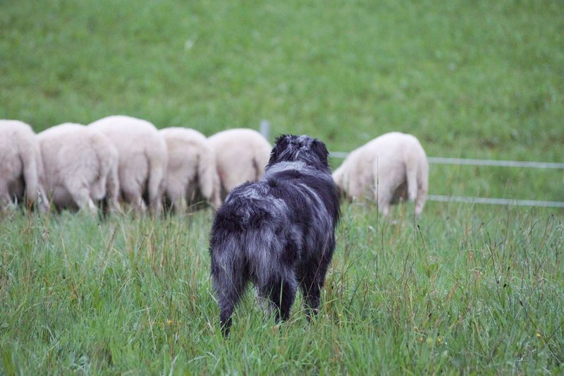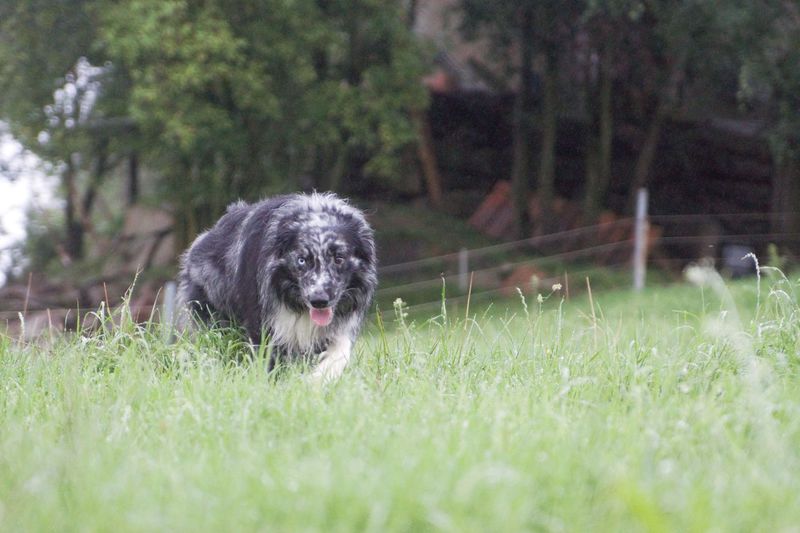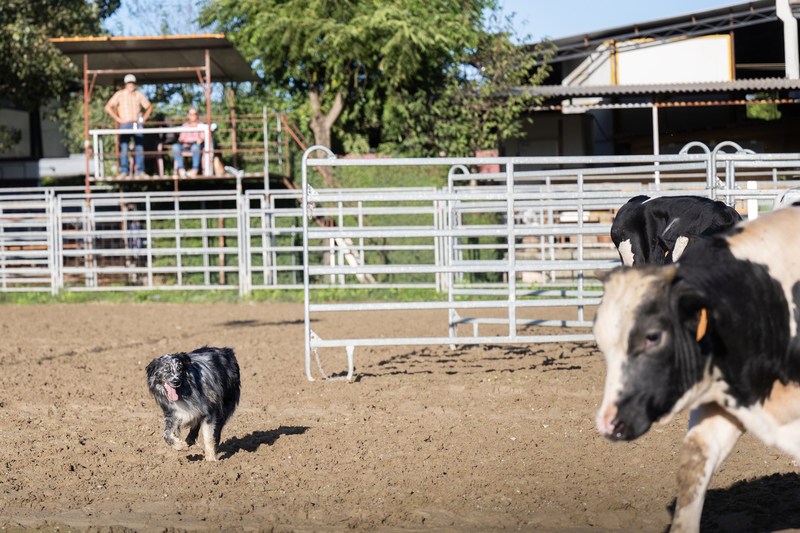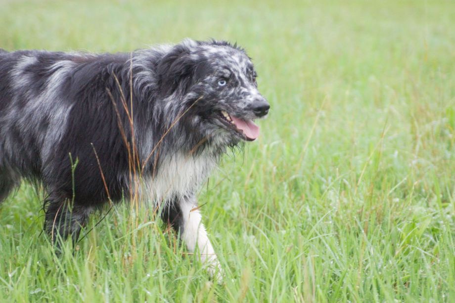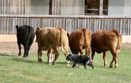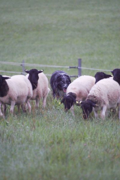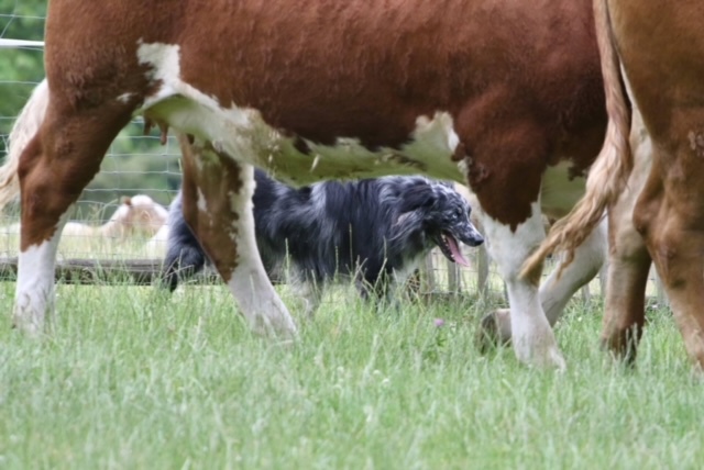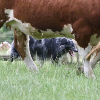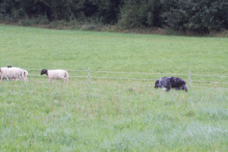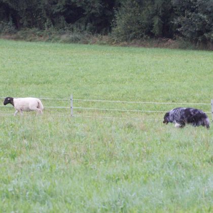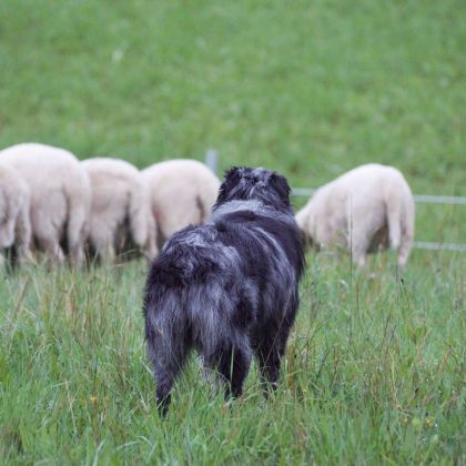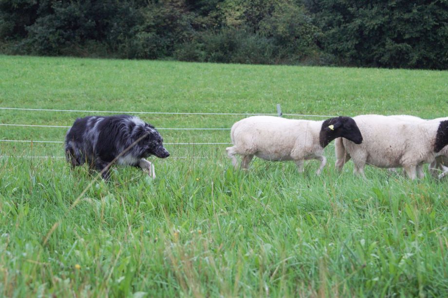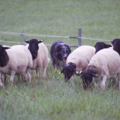 Bei der Arbeit am Vieh ist er ausgesprochen folgsam und rücksichtsvoll gegenüber den Lämmern und den älteren Tieren. Blue zeigt gute Impuls Kontrolle, ist nie hektisch oder Nervös bei den Tieren. Egal ob Enten, Gänse, Schafe,… er passt sich gut und schnell an.