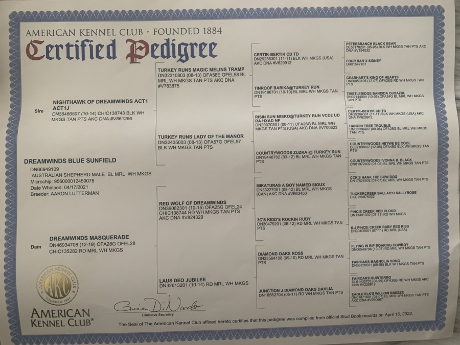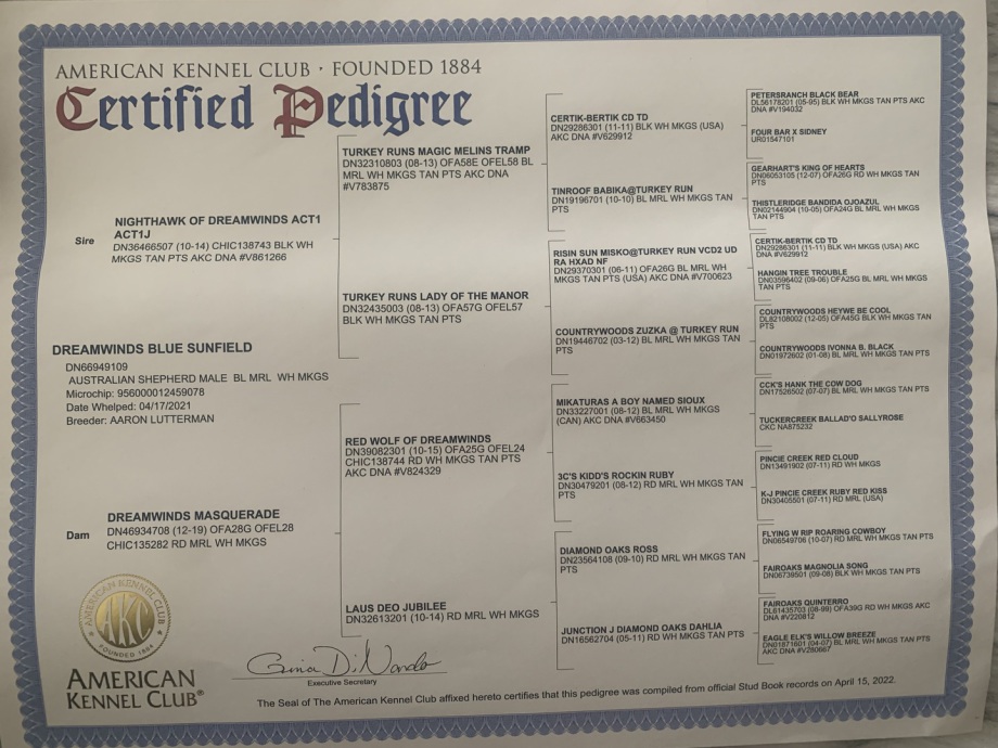 Vater: WTCH NightHawk of DreamWinds ( Thor) OFTDm AFTDdcs RV-N JV-N CL1 ACT1 ACT1J DNA-CP